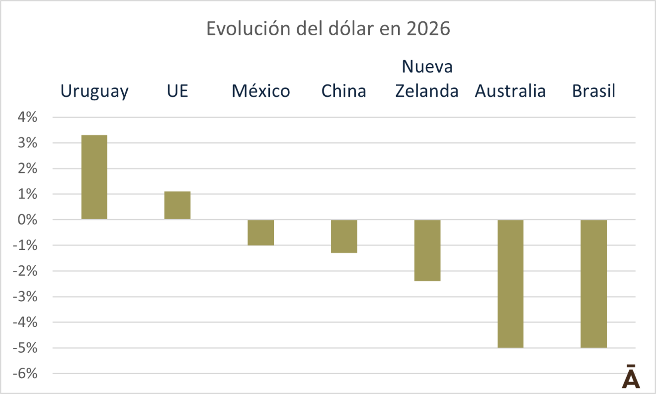 La apreciación del tipo de cambio en Uruguay en la última semana superó con amplitud lo ocurrido en otras economías de referencia. Por ejemplo, en Brasil el dólar bajó 0,6% (quedó en R$ 5,24), en Nueva Zelanda cayó 0,2%, en México subió 0,7%, mientras que en Australia se mantuvo estable.