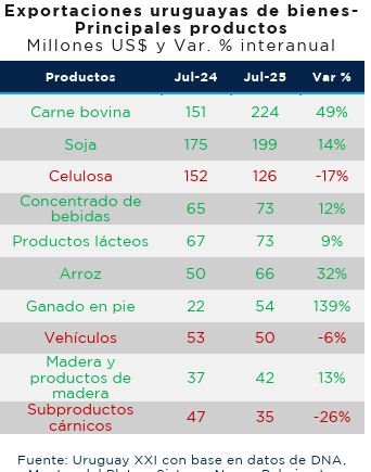 La carne bovina se posicionó en julio como el principal producto exportado, con colocaciones por US$ 224 millones y un aumento interanual de 49%. La soja ocupó el segundo lugar con un crecimiento del 14%, lo que se materializo en US$ 199 millones. La siguió la celulosa con US$ 126 millones y una caída de 17%. Los concentrados de bebidas alcanzaron US$ 73 millones, con un aumento del 12%, mientras que los productos lácteos, con un monto similar, crecieron 9% en relación con 2024.
