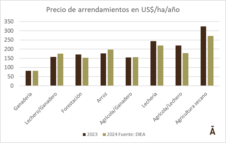 Los precios de los rubros que demandan más área se mantuvieron estables (ganadería y agrícola-ganadero), mientras que las rentas destinadas a agricultura de secano, forestación y lechería ajustaron a la baja. La renta arrocera, lechero-ganadero y ganadero-arrocero aumentaron su precio promedio en comparación con el ejercicio anterior.