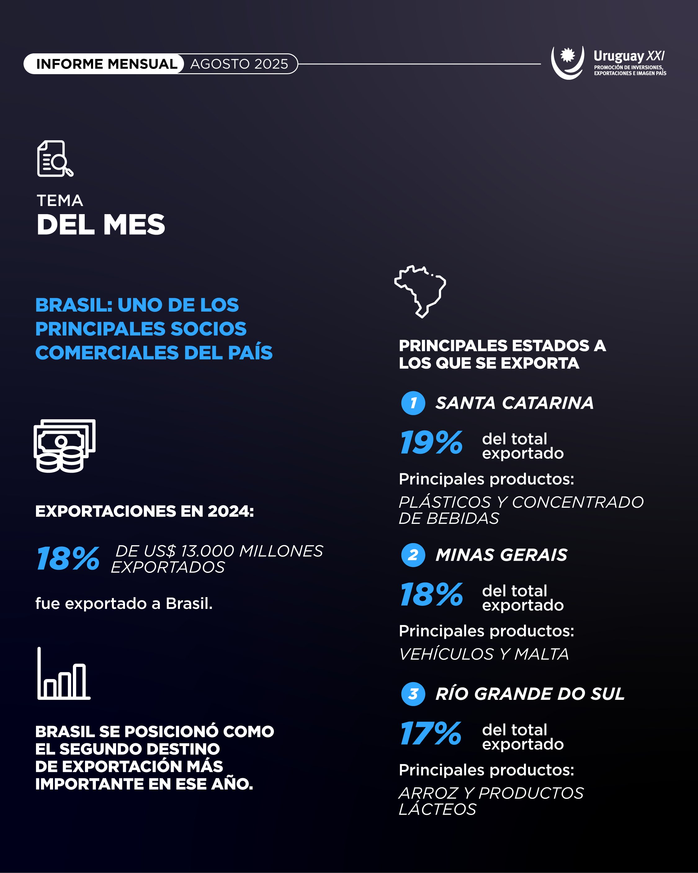 China continuó siendo el principal destino de exportación en agosto con ventas por US$ 437 millones y un crecimiento del 33% interanual. La soja, que fue el principal producto comercializado, alcanzó los US$ 254 millones en agosto, lo que implicó un crecimiento interanual de 141%, el cual acompañó el incremento de 160% en términos de volumen. La celulosa fue el segundo producto exportado hacia el país asiático con un total de US$ 76 millones y una caída interanual de 20%. En adición, se destacó un importante crecimiento del 51% en carne bovina, que permitió alcanzar ventas por un total de US$ 75 millones. Los subproductos cárnicos junto con la lana también destacaron por sus ventas en agosto, informó Uruguay XXI.