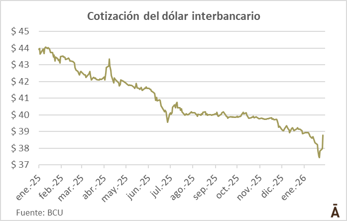 El dólar interbancario se anotó otra fuerte suba en el mercado cambiario uruguayo este miércoles. La última operación en el mercado mayorista se pactó a $ 38,90, esto fue un 1,6% por encima del cierre del martes.
