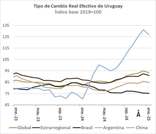 La recuperación que venía mostrando el Índice de Tipo de Cambio Real (TCR) efectivo global de Uruguay en el último año se interrumpió en enero. Según el Banco Central del Uruguay, el TCR global cerró el primer mes del 2025 con un valor de 93,3%, en baja de 1,7% versus diciembre. Respecto a igual mes del año pasado, el índice global está un 14% por arriba, que básicamente se explica por una mejora con Argentina (+81%) y con EEUU (+9,4%).