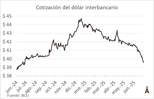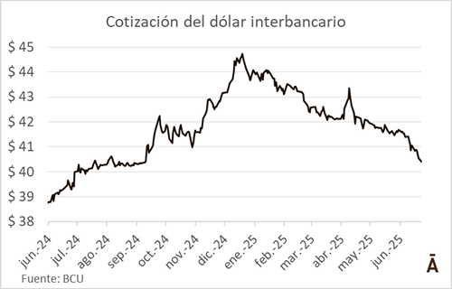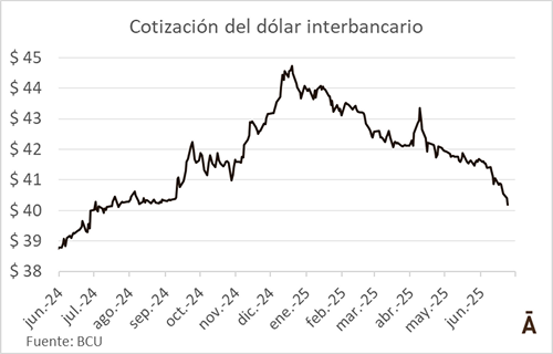 Junio fue un mes de fuerte caída para el tipo de cambio en Uruguay. La divisa estadounidense cerró en el promedio interbancario a $ 39,54 este lunes, último día hábil del mes, y perdió 5% (unos $ 2) en junio. El dólar acumuló así una depreciación de 10,2% versus el cierre del año pasado ($ 44,06) y la mitad de su caída se dio en el último mes del primer semestre. Para encontrar un tipo de cambio nominal en estos niveles hay que remontarse a julio del año pasado.