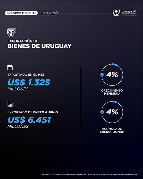 En junio de 2025, las solicitudes de exportación de bienes, incluidas las zonas francas, alcanzaron US$ 1.325 millones y marcaron un aumento interanual de 4%, informó ayer Uruguay XXI. Las exportaciones de junio estuvieron impulsadas principalmente por las ventas de carne bovina, vehículos y ganado en pie. En el primer semestre de 2025, las exportaciones de bienes, incluidas las zonas francas, totalizaron US$ 6.451 millones, lo que implicó una suba interanual de 4%.