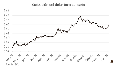 El dólar interbancario subió con fuerza por segunda jornada consecutiva en la operativa de este lunes en Uruguay. El promedio interbancario quedó en $ 42,87 (+0,8%), mientras que la última transacción de la jornada se pactó a $ 42,95 (+1,1%), según Bevsa. El tipo de cambio en Uruguay había caído en enero (-2%), febrero (-1,2%) y marzo (-1%), mientas que en el parcial de abril la moneda se recupera 1,7% frente al peso uruguayo, en medio de los coletazos a nivel internacional que está generando la guerra comercial desatada por el presidente Donald Trump y los temores por una recesión de la principal economía mundial.