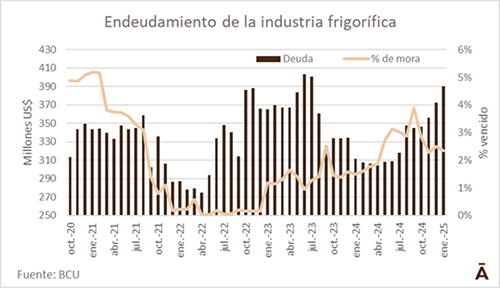 La industria frigorífica uruguaya tenía al cierre de enero créditos con la banca pública y privada por unos US$ 390 millones, según datos del Banco Central del Uruguay (BCU). Respecto a enero de 2024 hay un aumento del pasivo de unos US$ 79 millones. Además, se trata del mayor nivel de endeudamiento desde julio de 2023, cuando ascendía a US$ 401 millones.