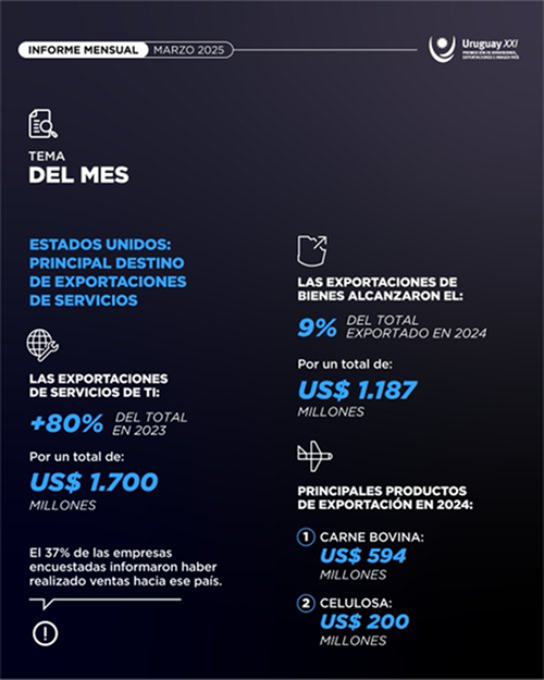 En marzo de 2025, las solicitudes de exportación, incluidas las zonas francas, alcanzaron US$ 1.060 millones y marcaron un aumento interanual de 14%. Las exportaciones de este mes estuvieron impulsadas principalmente por las ventas de celulosa (+57%), carne bovina (+28%), concentrados de bebidas (+37% y lácteos (+27%), según Uruguay XXI.