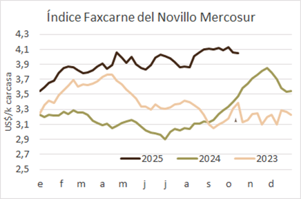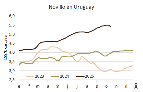 INAC informó que la semana pasada, la terminada el 11 de octubre, el precio de compra del novillo fue superior al precio de exportación de la carne vacuna, una coyuntura que se da por la relativa escasez de hacienda terminada, que lleva a la industria a competir intensamente por la materia prima, pero que no es sostenible en el mediano plazo.