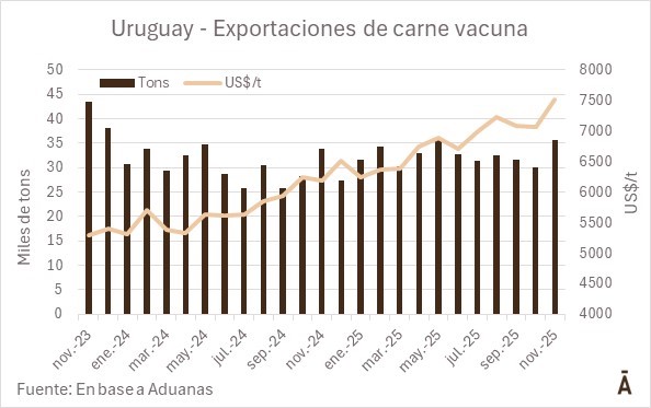 El valor medio de la carne vacuna exportada por Uruguay en noviembre fue de US$ 7.519 por tonelada peso embarque, referencia récord para las exportaciones del país. El dato surge de las solicitudes de exportación informadas por Aduanas.