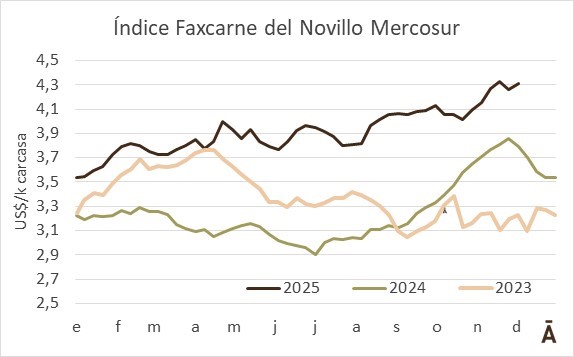 Los precios del ganado a faena tendieron al alza esta semana, impulsados por subas en Argentina y Uruguay y por la valorización del real. El Índice WBR del Novillo Mercosur recuperó 5 cents en la semana a US$ 4,31 el kilo carcasa.