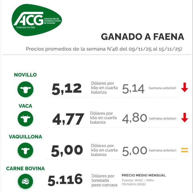 Tras un fuerte ajuste bajista desde mediados de octubre, los precios de la hacienda insinúan haber alcanzado cierta estabilidad. “Demanda con mayor interés de compra, ingresando en la recta final de la ventana de cuota; se atenúa el ajuste de valores, con entradas más cortas”, dijo la ACG en su comentario tras su reunión de precios de este lunes 17 de noviembre.