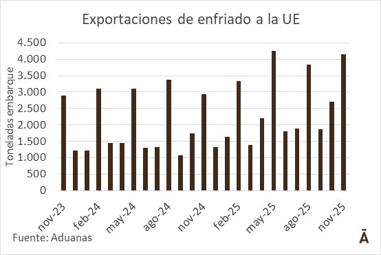 Con las exportaciones para la cuota 481 que estará ingresando al mercado europeo a principios de 2026, los embarques de carne vacuna enfriada a los países de la Unión Europea ascendieron a 4.156 toneladas en noviembre, un volumen superior a las 3.841 toneladas de la anterior ventana de cuota.