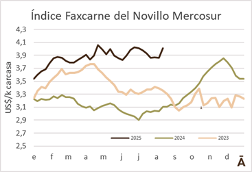 Los precios del ganado a faena subieron de forma generalizada en los cuatro países del Mercosur. El Índice Faxcarne del Novillo Mercosur recuperó 15 cents en la semana a US$ 4,01 el kilo carcasa, superando la barrera de los US$ 4 por primera vez en seis semanas.