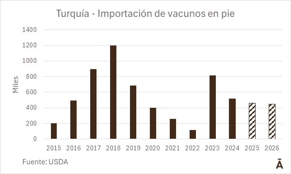 En 2026, las importaciones de vacunos en pie por parte de Turquía se proyectan estables en 450.000 cabezas para compensar la pérdida de animales por los altos niveles de faena en 2024, según la oficina del USDA en Ankara. En línea con las tendencias históricas, la mayoría de estos animales serán terneros de engorde destinados a producción de carne.
