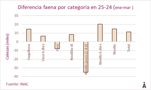 La escasez de novillos y los altos precios del ganado a faena están haciendo crecer la actividad industrial con vaquillonas. En lo que va del año la faena de vacunos creció 3,5% anual, con un moderado aumento en la cantidad de novillos y una disminución, también moderada, de las vacas. Sin embargo, la faena de vaquillonas creció un consistente 18,5% anual en lo que va de 2025 hasta el 19 de abril.