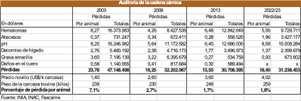 En la presentación de los resultados de la auditoría indicaron que las pérdidas se calculan en función de los siguientes criterios: a) kg de carne perdida por remoción, como es el caso de hematomas y abscesos y b) cambio de mercado por pérdida de calibre del corte por motivos antes mencionado o porque el mercado no lo acepta con ese defecto, como es el caso de pH alto o corte oscuro.