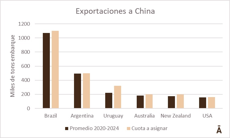Quien estaría más alejado sería Uruguay, quien en su año pico (2021) embarcó a China 295 mil toneladas y en el promedio de 2020 a 2024 223 mil tons. En todos los casos las cuotas manejadas superan el promedio de embarques de los países informados.