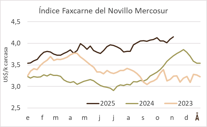 Con fuerzas que actuaron de forma contrapuesta en la última semana, el valor medio del novillo Mercosur aumentó y alcanzó el nivel más alto desde mediados de 2022, más de tres años atrás. El Índice Faxcarne del Novillo Mercosur subió 5 cents en la semana a US$ 4,15 el kilo carcasa.