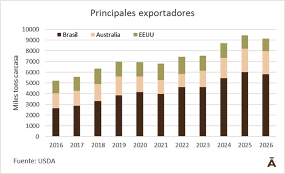 El USDA proyecta un descenso de las exportaciones de los tres principales proveedores del mercado internacional. Brasil bajaría en una cantidad significativa de 250 mil toneladas carcasa (a 4 millones de toneladas), Estados Unidos en 64 mil toneladas a 1,154 millones y Australia en modestas 20 mil toneladas a 2,165 millones.