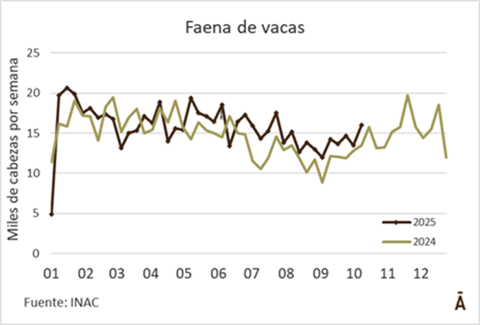La faena de vacunos dejó atrás tres semanas consecutivas en las que se ubicó por debajo de las 40 mil cabezas para superar ese umbral en la culminada el 11 de octubre. INAC informó que se procesaron 41.067 vacunos, 6.518 más (19%) que en la semana anterior y 5% por encima de la misma del año pasado.