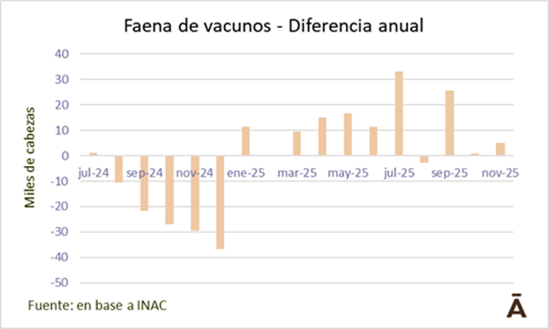 Aunque bajó respecto a la anterior, la faena de vacunos se mantuvo por encima de las 50 mil cabezas por cuarta semana consecutiva. INAC informó que en la semana al 29 de noviembre se procesaron 51.173 vacunos, 2.730 menos que en la anterior (-5%), pero 7.600 más que en igual semana del año pasado.