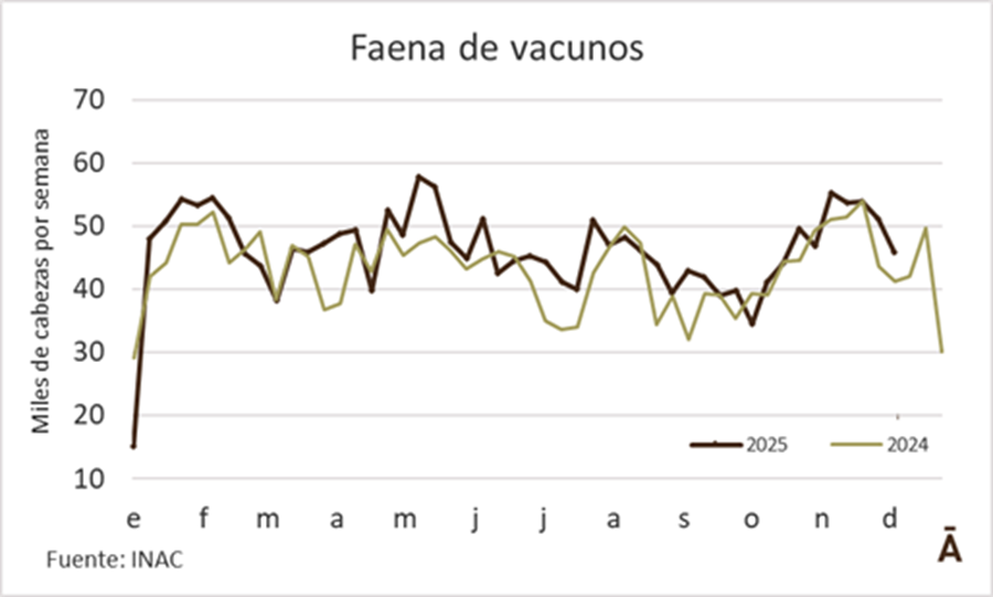 La faena de vacunos sufrió una contracción de relativa significación. INAC informó que en la semana al 6 de diciembre se procesaron 45.884 vacunos, 10% menos que en la anterior, aunque 11% por encima del mismo período del año pasado.
