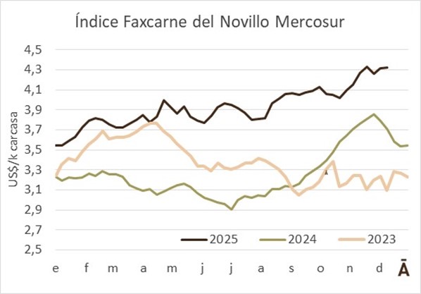 Hubo tendencias dispares en los precios del ganado a faena en los países de la región, con algunos en baja (Brasil y Uruguay) y otros en alza (Paraguay y, fundamentalmente, Argentina). El Índice WBR del novillo Mercosur aumentó 1 cent en la semana a US$ 4,32 el kilo carcasa.