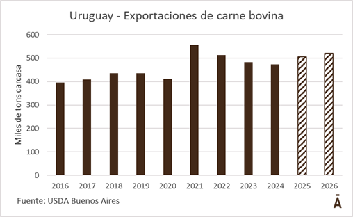 La oficina del USDA en Buenos Aires proyecta exportaciones uruguayas de carne vacuna en 2026 de 520 mil toneladas peso carcasa, el segundo mayor volumen de la historia, solo detrás del pico de 2021. Además, corrigió al alza la estimación de exportaciones para 2025 de 485 mil a 506 mil toneladas como consecuencia de la expectativa de una mayor faena y producción.