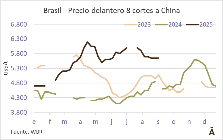 “China sigue flojísima, con bids que están entre US$/t 200-300 por debajo de lo que pretenden los exportadores”, dijo un trader brasileño en diálogo con World Beef Report (WBR). En la misma línea, un exportador indicó que por el delantero 8 cortes lo máximo que consiguió fueron US$/t 5.600 CFR. “La demanda sigue pobre”, aseguró.