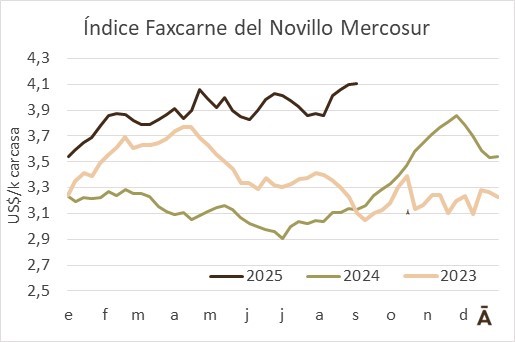 El valor medio del ganado en la región subió por cuarta semana consecutiva. El Índice Faxcarne del Novillo Mercosur aumentó 1 cent en la semana a US$ 4,11 el kilo carcasa, el valor medio más alto desde 2022 y 15 cents por encima del piso de cuatro semanas atrás.