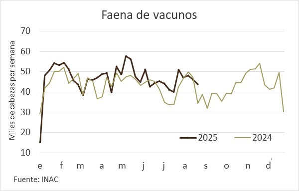El grueso de producción para la cuota europea 481, de carne de animales terminados en corrales de engorde, había quedado atrás la semana anterior, por lo que en la pasada, terminada el 23 de agosto, se dio una previsible baja en la cantidad de animales procesados, especialmente en el caso de novillos y vaquillonas.