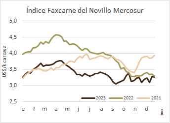 Los precios de la hacienda para faena en el Mercosur cierran el año 2023 con tendencia dispares. Mientras se mantienen las subas en Brasil y Uruguay, se dieron correcciones a la baja en Paraguay y, fundamentalmente, Argentina. El Índice Faxcarne del Novillo Mercosur bajó un cent en la semana a US$ 3,27 el kilo carcasa.