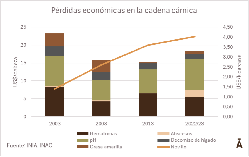 Días atrás, INIA e INAC presentaron los resultados de la auditoría cárnica en 2022/23, que arrojó resultados similares a los de 2013, una década atrás. Las pérdidas por abscesos, hematomas, pH y grasa amarilla se estiman en US$ 18,4 por animal faenado, lo que implica un total —teniendo en cuenta la cantidad de animales procesados— de US$ 31,2 millones, niveles similares a los que habían arrojado las auditorías de 2008 y 2013.