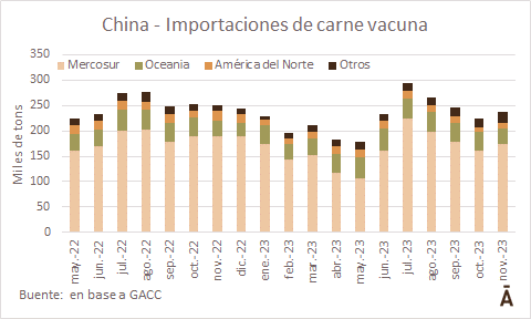 En noviembre China importó 236.666 toneladas peso embarque de carne vacuna a un valor medio de US$/t 4.966, de acuerdo con datos dados a conocer por el GACC. El volumen es 13 mil tons superior al de octubre, en tanto que el valor medio se recuperó unos US$/t 200 (4,2%), dejando por el momento atrás el piso de octubre.