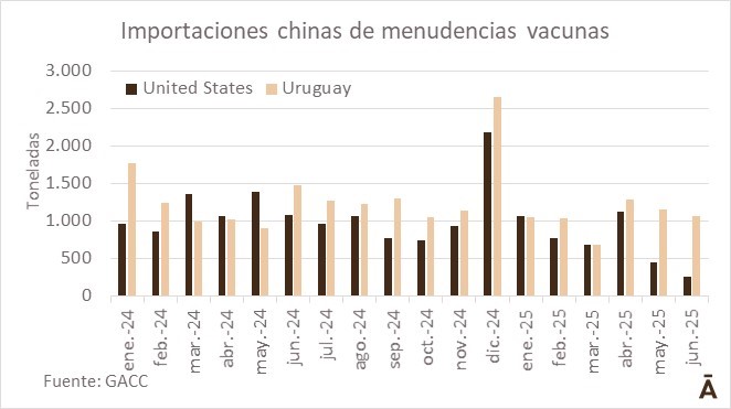 Las importaciones chinas de menudencias vacunas se concentran en el producto de Uruguay y Estados Unidos, apareciendo en un segundo escalón Rusia y Nueva Zelanda. Pero los problemas de acceso de EEUU impactaron fuertemente sobre los volúmenes desde este origen.