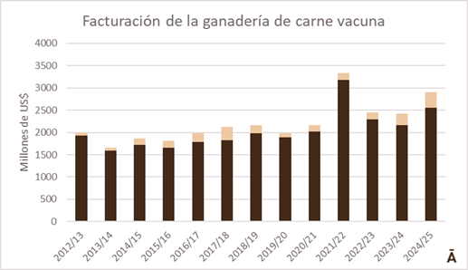 La ganadería uruguaya cerró un gran ejercicio 2024/25, impulsada por un mercado internacional pujante y con altos precios que se trasladaron a los valores de la hacienda, tanto de los animales a faena como los de la reposición y cría. Las ventas finales de la ganadería vacuna se estiman en unos US$ 2.900 millones, solo por detrás del pico de más de US$ 3.300 millones de 2021/22, cuando Uruguay batió récords de faena y precios.