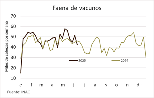 La faena de vacunos en el ejercicio 2024/25, ya en su recta final, se ubicará en el entorno de los 2,33 millones de cabezas, con un descenso mínimo respecto al anterior, cercano a las 50 mil cabezas, determinado por una caída consistente en la cantidad de vientres enviados a faena.