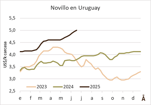 El precio del novillo especial de exportación alcanzó los US$ 5 en la última semana, referencia a la que no llegaba desde agosto de 2022, casi tres años atrás. La firmeza del mercado persiste, con la demanda necesitada de una materia prima que no abunda.