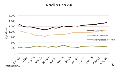 El índicador del Novillo Tipo 2.0 correspondiente a mayo tuvo un incremento mensual de 2,6% (+US$ 44) impulsado por la canasta de productos exportados, así como también de la canal al mercado interno, según el INAC.