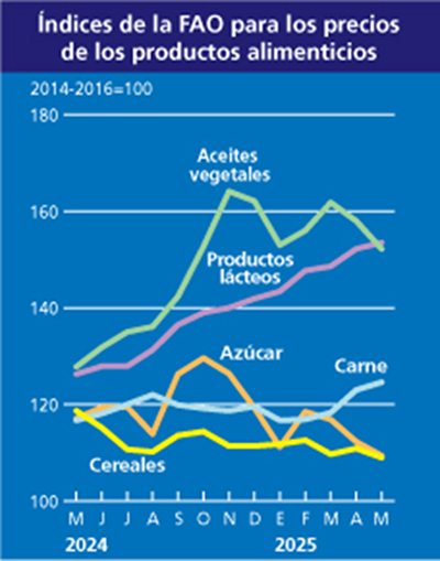 El índice de precios de la carne de la FAO registró en mayo un promedio de 124,6 puntos, lo que supone una subida de 1,6 puntos (un 1,3 %) respecto del valor revisado de abril y 7,9 puntos (un 6,8 %) por encima de su nivel de hace un año.