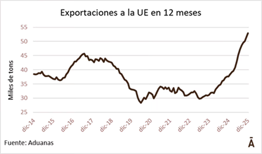 El viernes 2 de enero habían quedado en espera para ingresar dentro de la cuota europea 481 un volumen de 5,53 miles de toneladas, más que duplicando el cupo para este año —y los próximos— que es de 2.500 toneladas trimestrales para terceros países.