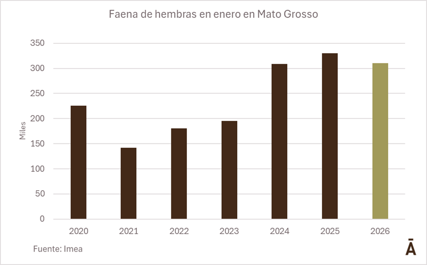 La faena total de bovinos en el estado de Mato Grosso alcanzó 641,04 mil cabezas en enero de 2026, récord para el mes y un aumento mensual de 5,45%, de acuerdo con datos del INDEA informados por el Instituto Matogrossense de Economía Agropecuaria (Imea).