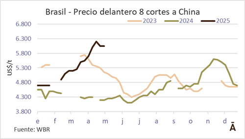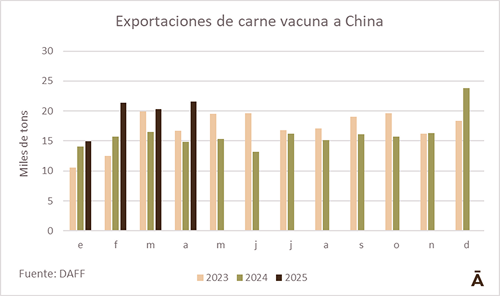 El valor medio de exportación de la carne vacuna fresca tuvo un salto significativo en abril. De acuerdo con datos de solicitudes de exportación informados por Aduanas, Uruguay vendió al exterior 33.062 toneladas de a un valor medio de US$/t 6.850; respecto a marzo, el volumen aumentó en unas 3 mil toneladas, en tanto que el valor medio subió un robusto 7%, casi US$/t 500, alcanzando el nivel más alto desde setiembre de 2022, 32 meses atrás.