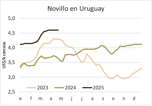 Los precios de la hacienda se mantuvieron tonificados en la semana de Pascuas. De acuerdo a la reunión de precios de la ACG de este lunes, “con menos días de faena, continúa la demanda sostenida; mercado estable”. Así, los novillos gordos se negociaron a US$ 4,58 por kg carcasa durante la semana al 19 de abril (+1 cent), mientras que las vacas gordas a US$ 4,29 y las vaquillonas a US$ 4,41 por kg a la carne se mantuvieron sin cambios respecto a siete días atrás.
