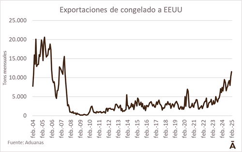 Las exportaciones uruguayas de carne vacuna a Estados Unidos siguen creciendo a gran ritmo. En febrero, de acuerdo con datos de Aduanas basados en las solicitudes de exportación, fue el destino de 11.566 toneladas peso embarque de carne vacuna congelada, 56% más que en el mismo mes de 2024 y el mayor volumen mensual desde mediados de 2007, 18 años atrás, cuando Estados Unidos era el principal cliente comercial de los frigoríficos uruguayos. Luego fue sobrepasado por Rusia y a partir de mediados de la década pasada por China.