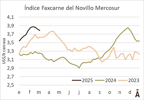 A pesar de la firmeza y los precios en alza en los otros tres países de la región, el gran peso relativo de Brasil hizo caer el valor medio del ganado a faena esta semana. El Índice Faxcarne del Novillo Mercosur bajó 4 cents a US$ 3,78 el kilo carcasa y acumula un descenso de 10 cents en las últimas tres semanas.