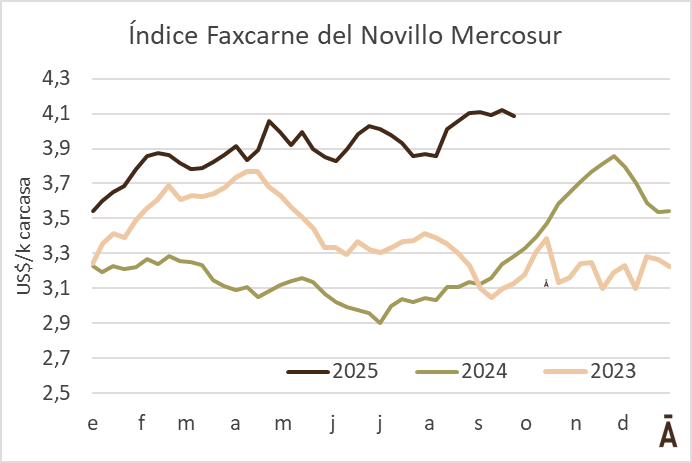 El valor medio del ganado a faena en la región bajó 3 cents en la semana como consecuencia de caídas en Argentina y Brasil que fueron parcialmente contrarrestadas por la firmeza de los mercados paraguayos y uruguayos.