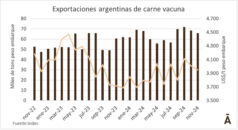 Las exportaciones de carne bovina enfriada y congelada de Argentina alcanzaron en noviembre 65.975 toneladas peso producto, lo que equivale a una caída de 5,3% respecto del mes anterior y a un alza de 8,8% frente a noviembre del año pasado. En valor, los despachos de noviembre redondearon US$ 260,5 millones, 6,8% menos que el mes previo y 16,1% más que en noviembre de 2023.