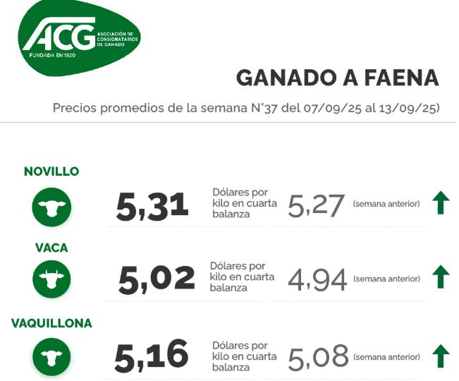 “Continúa la buena demanda manteniendo la faena. Entradas ágiles; mercado firme”, dijo la ACG en su comentario tras su reunión de precios de este lunes. Para la semana al 13 de setiembre, los consignatarios fijaron una referencia promedio de US$ 5,31 por kg a la carne para el novillo (+4 cents), de US$ 5,02 para la vaca gorda (+8 cents), y de US$ 5,16 para las vaquillonas (+8 cents). En tanto, los novillos especiales de exportación avanzaron 3 cents y cerraron la última semana US$ 5,37 por kg en promedio.