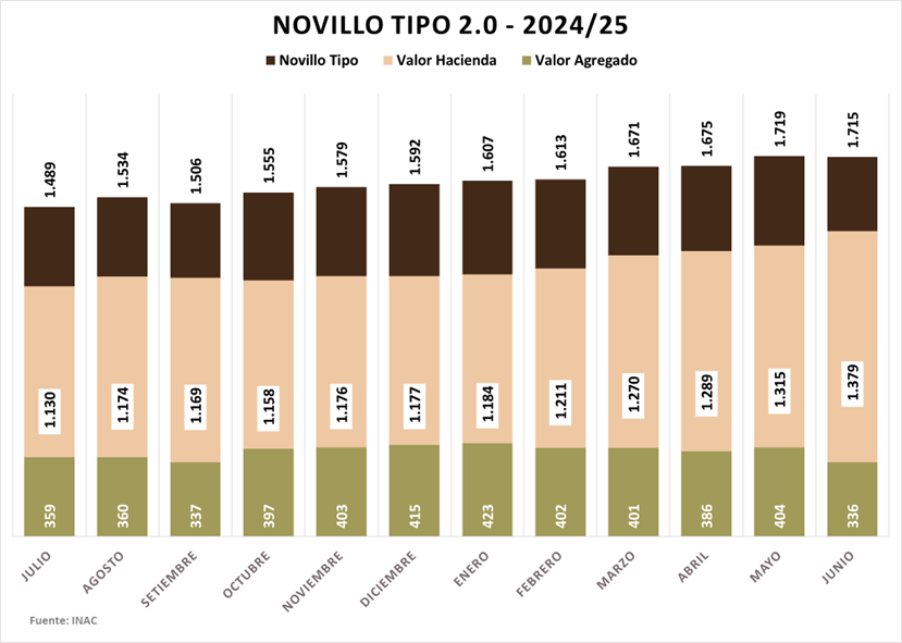 El último informe del Novillo Tipo, divulgado por el Instituto Nacional de Carnes (INAC), indicó que el valor generado por la venta de todos los productos luego del proceso industrial presentó un incremento de 3,6% en el mes de agosto, respecto al mes anterior. El indicador se ubicó en 1.787 dólares por cabeza, situándose en su mayor nivel desde agosto de 2022 cuando se posicionaba en US$ 1.813.